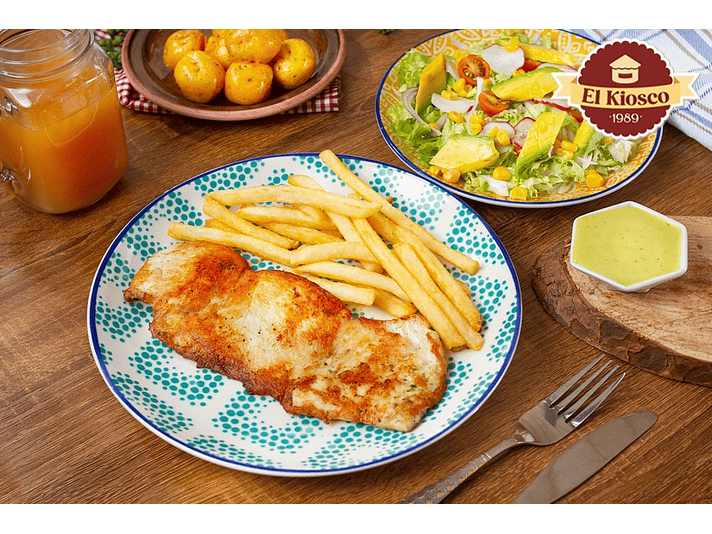 Pechuga de pollo adobada en hierbas, acompañado de papa a la francesa o papa criolla y ensalada de El Kiosco.